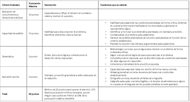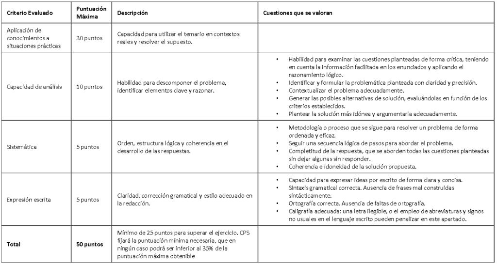 Calificación: de 0 a 50 puntos. Será necesario obtener una calificación mínima de 25 puntos para superarlo. CPS fijará la puntuación directa mínima necesaria que se debe alcanzar para superar el ejercicio, que no podrá ser inferior al 30 por ciento de la puntuación máxima obtenible.
